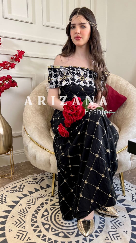 الوصف : جلابيه أسود مطرزه بذهبي