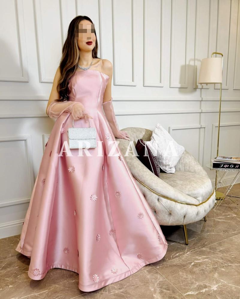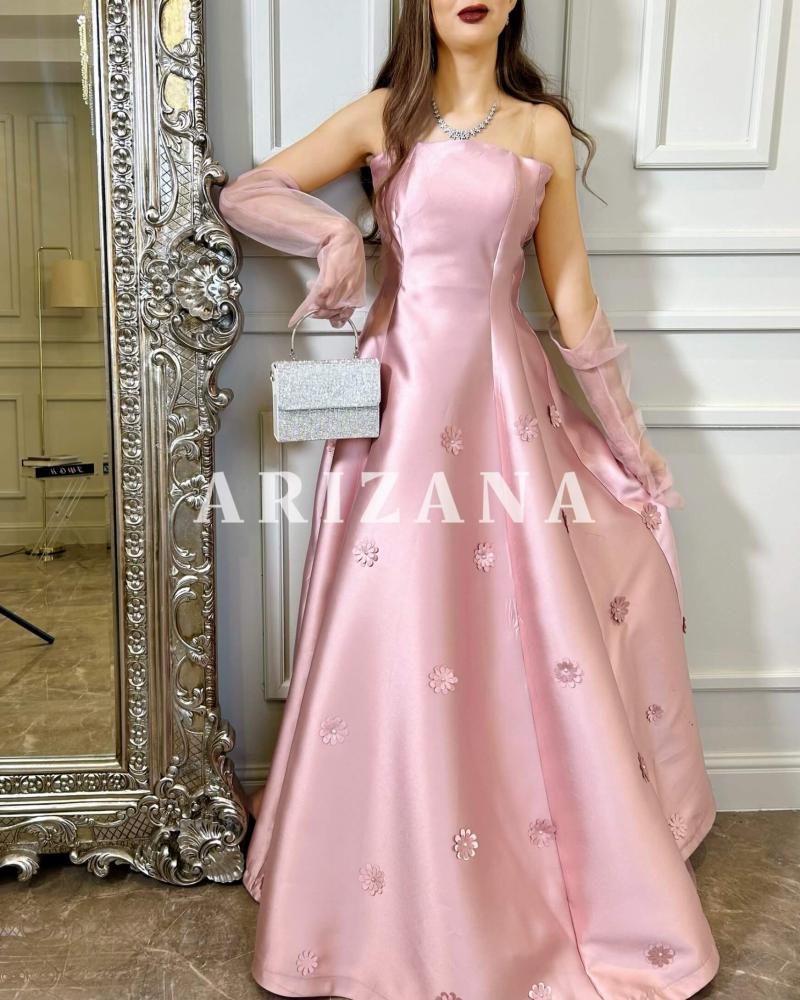 الوصف : فستان بلون وردي انثوي جميل ويتميز بخامة مخلوط من التفته والساتان مع قفازات من التل شفافه
